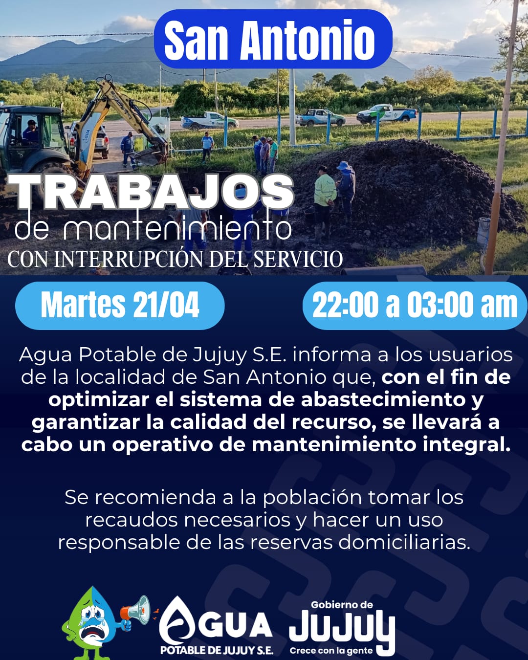 Agua Potable de Jujuy S.E. informa a los usuarios de la localidad de San Antonio que, con el fin de optimizar el sistema de abastecimiento y garantizar la calidad del recurso, se llevará a cabo un operativo de mantenimiento integral.