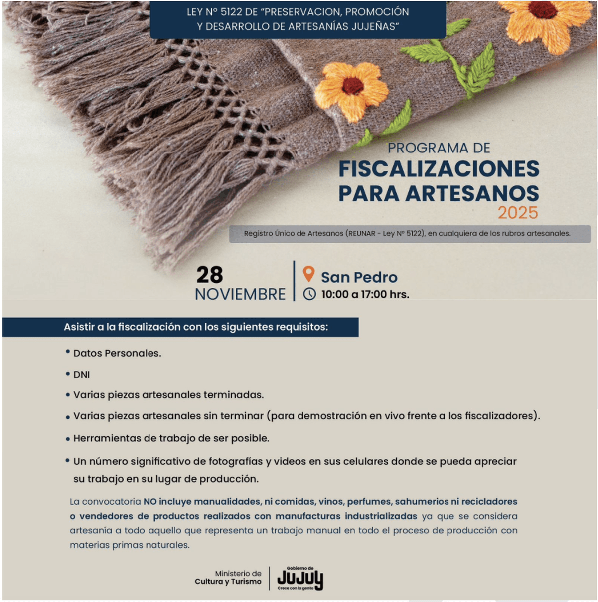 Este jueves habrá una jornada de fiscalización para que artesanos se registren oficialmente y accedan a los beneficios de la Ley de Artesanías Jujeñas.