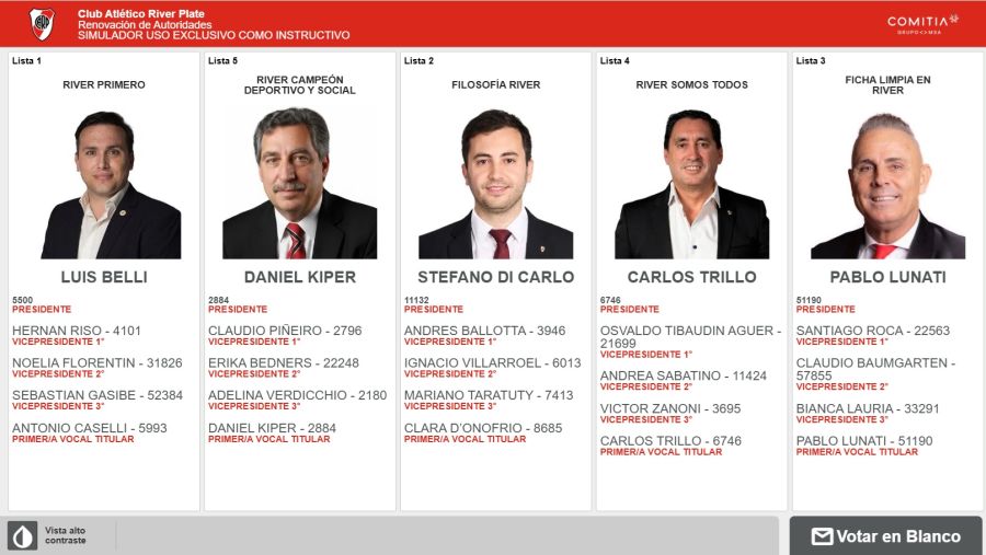 El candidato del oficialismo es Stefano Di Carlo —actual secretario general del club y de apenas 36 años—, que busca suceder a los dos mandatos de Rodolfo D'Onofrio y al actual de Jorge Brito. Lo acompañan cuatro listas opositoras, encabezadas por Carlos Trillo, Pablo Lunati, Daniel Kiper y Luis Belli.