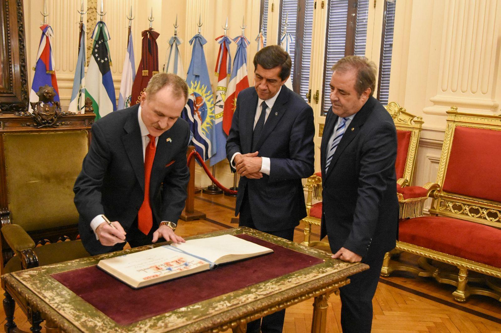 El vicegobernador Alberto Bernis acompañó al gobernador Carlos Sadir en la recepción oficial al embajador de Estados Unidos en Argentina, Peter Lamelas, durante un acto realizado en el Salón de la Bandera de la Casa de Gobierno, que incluyó posteriormente una reunión en el Salón Fascio.