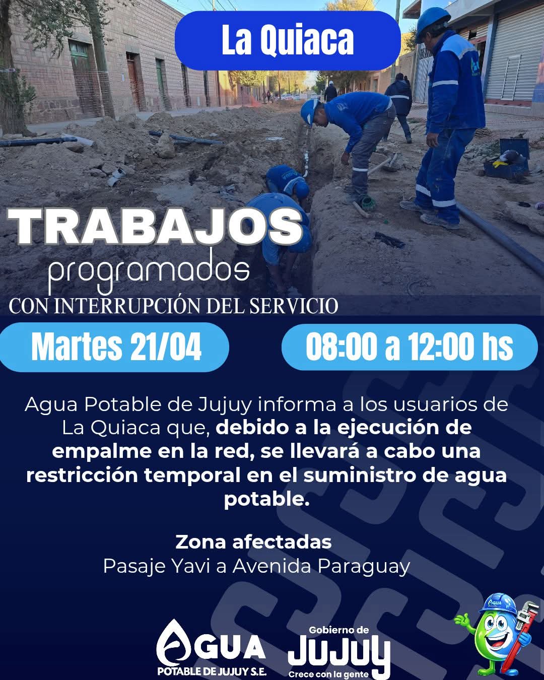 Agua Potable de Jujuy informa a los usuarios de La Quiaca que, debido a la ejecución de empalme en la red, se llevará a cabo una restricción temporal en el suministro de agua potable.